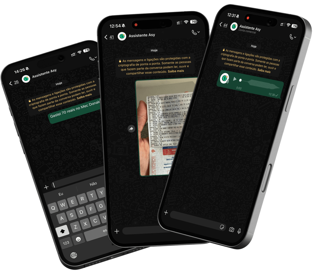 Registre suas despesas e receitas por foto, áudio, texto ou PDF